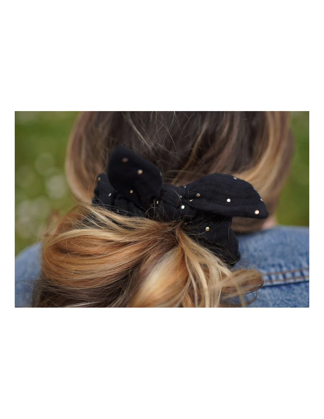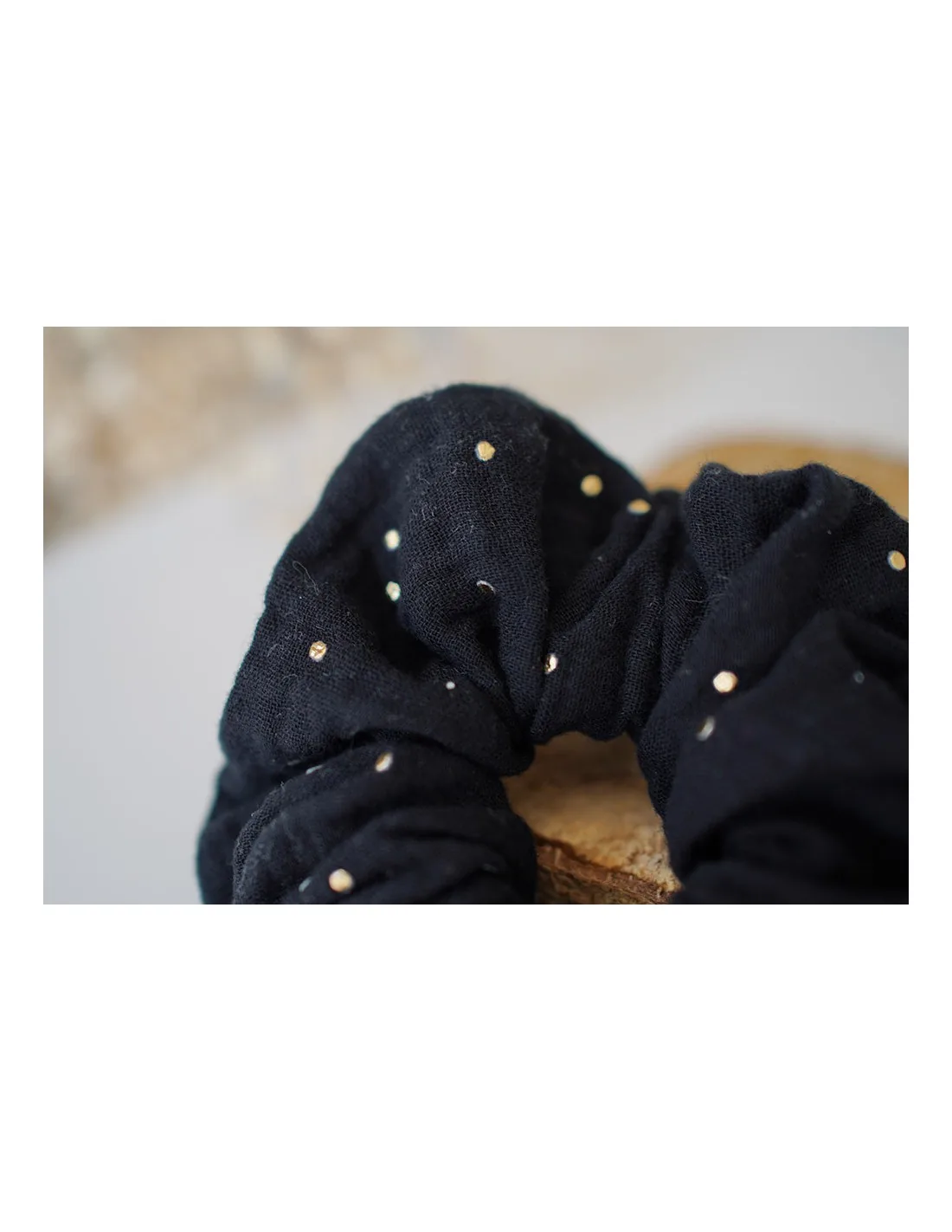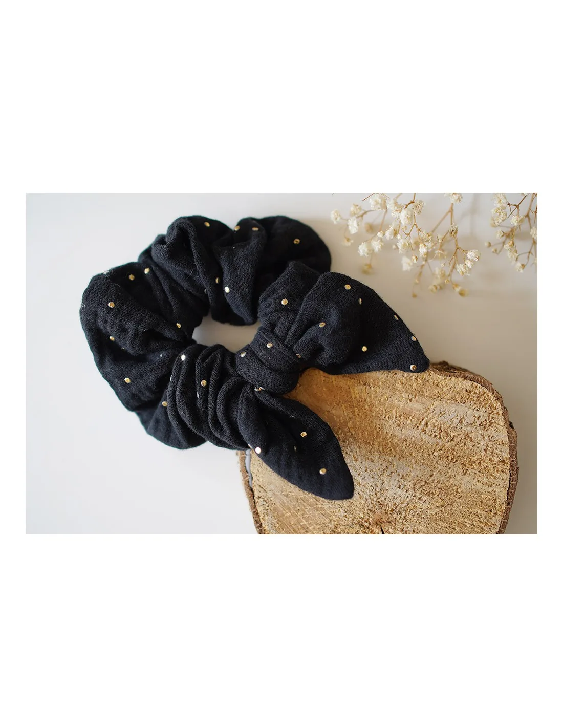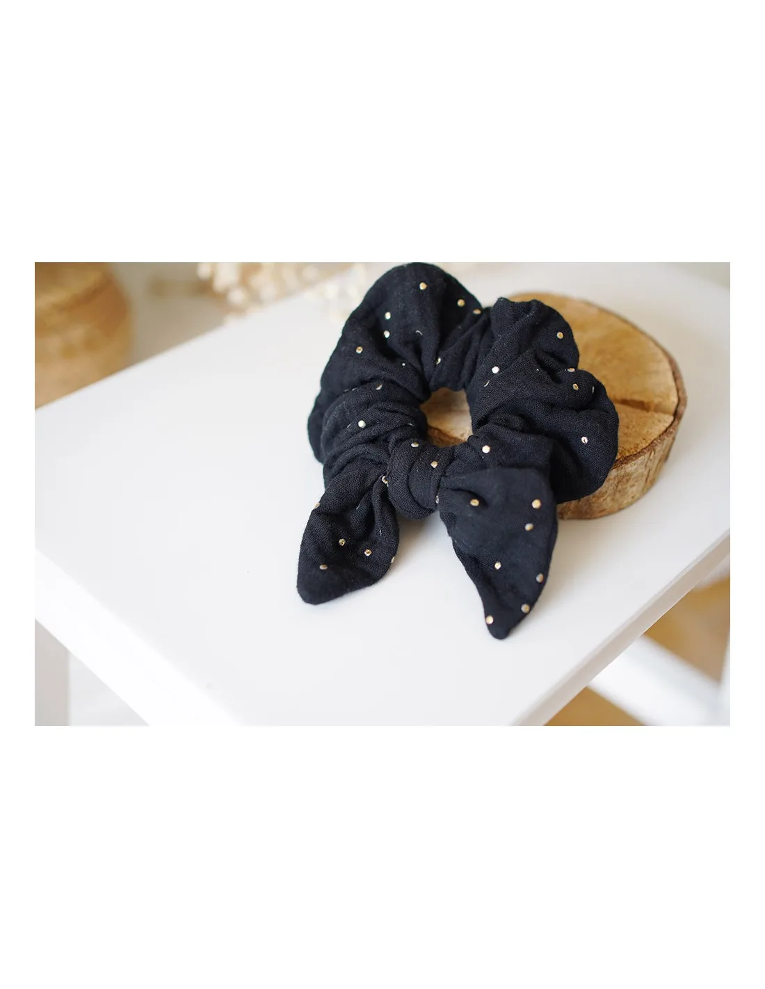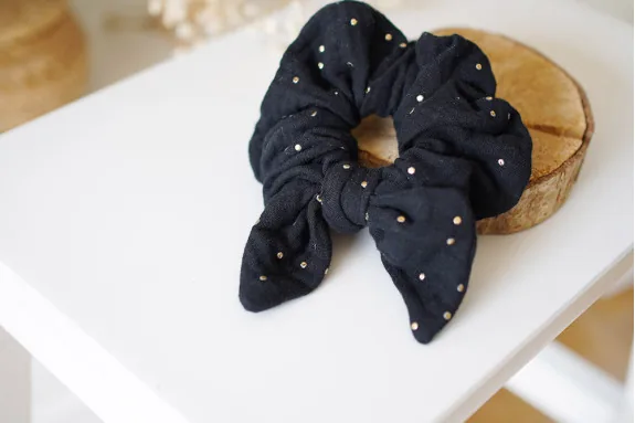 Chouchou en gaze de coton noir avec un noeud et orné de jolis pois dorés fabriqué en France.