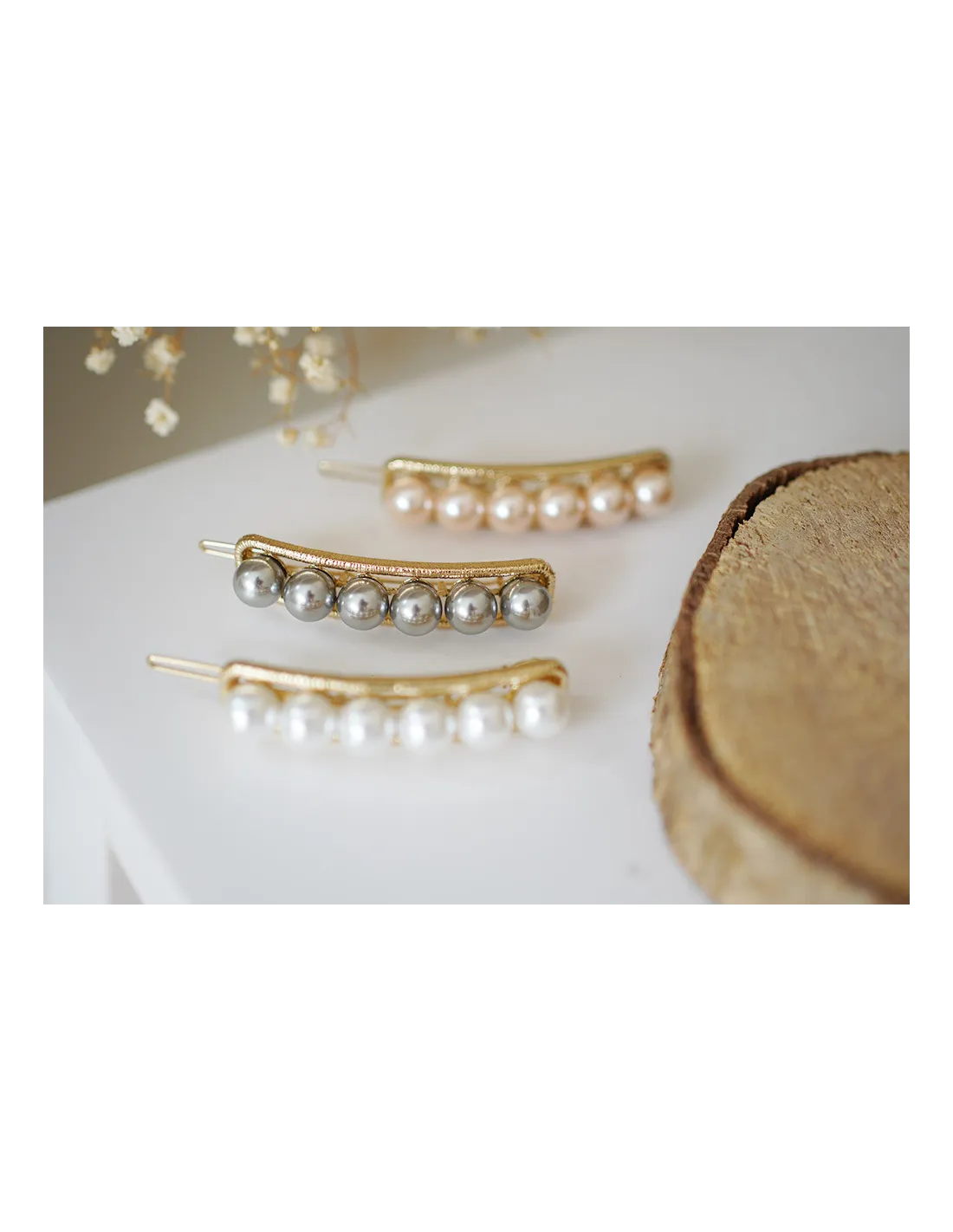 Notre barrette Rachelle est disponible en trois coloris : blanc, gris et rose.