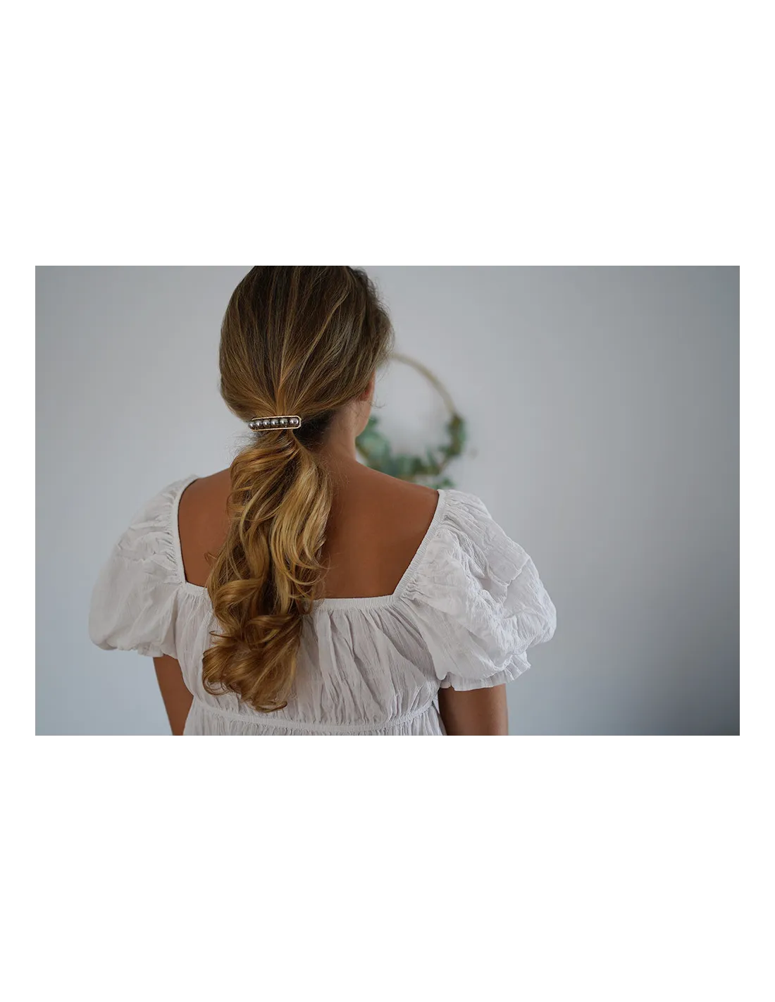 Vous pouvez simplement attacher deux mèches à l'arrière de votre tête avec notre barrette Rachelle, tout en laissant quelques mèches sur votre visage !
