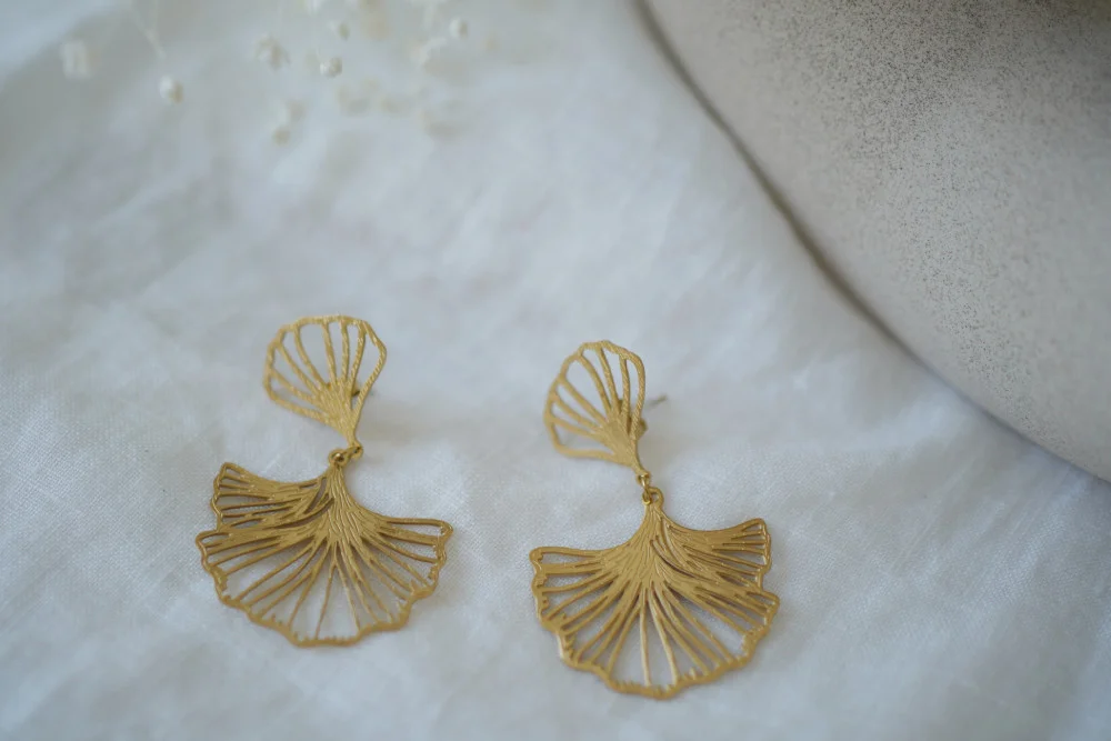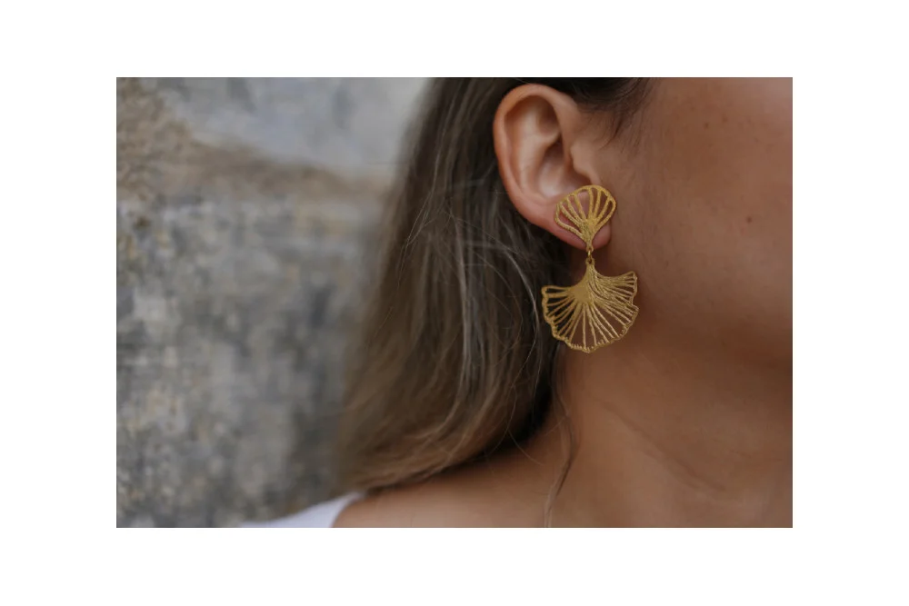Boucles d'Oreilles en forme de feuilles de Ginkgo dorées.