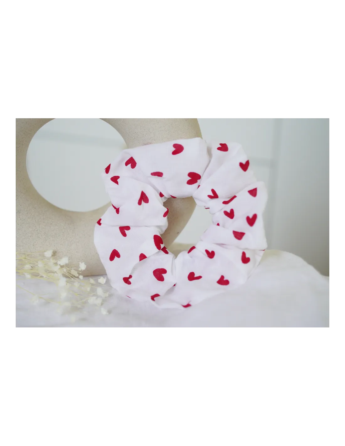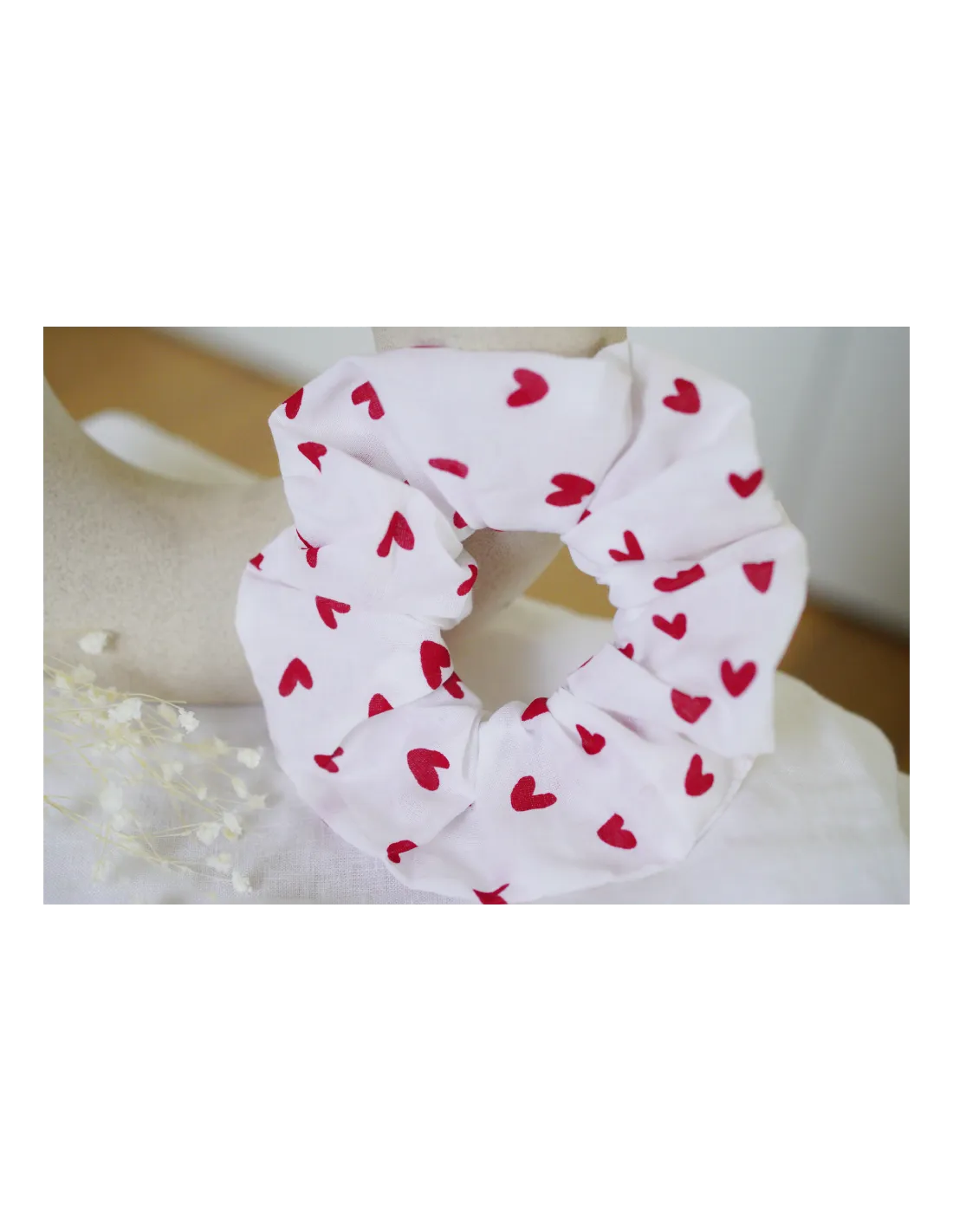 Un chouchou en coton blanc délicatement orné de cœurs rouges, parfait pour apporter une touche romantique et élégante à toutes les coiffures.
