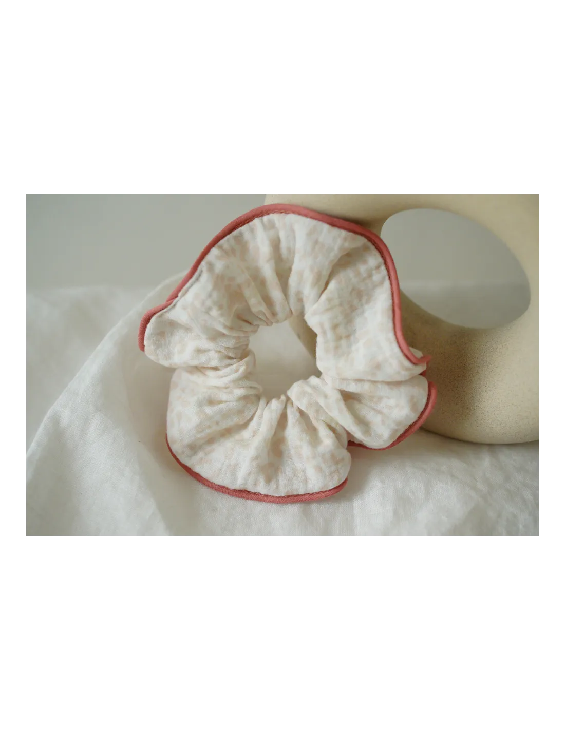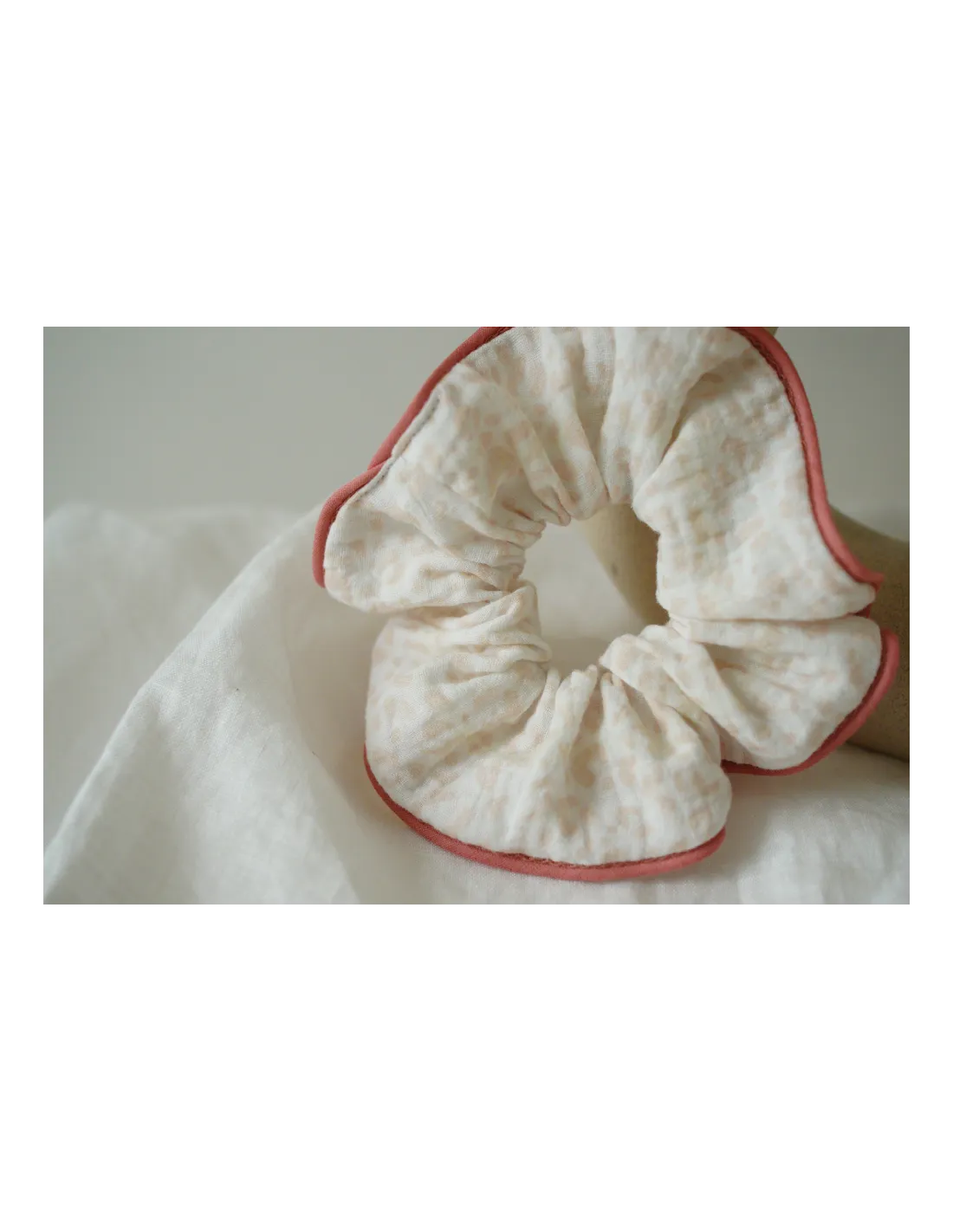 Un chouchou en double gaze de coton léopard nude sur fond blanc cassé, doux et lumineux.