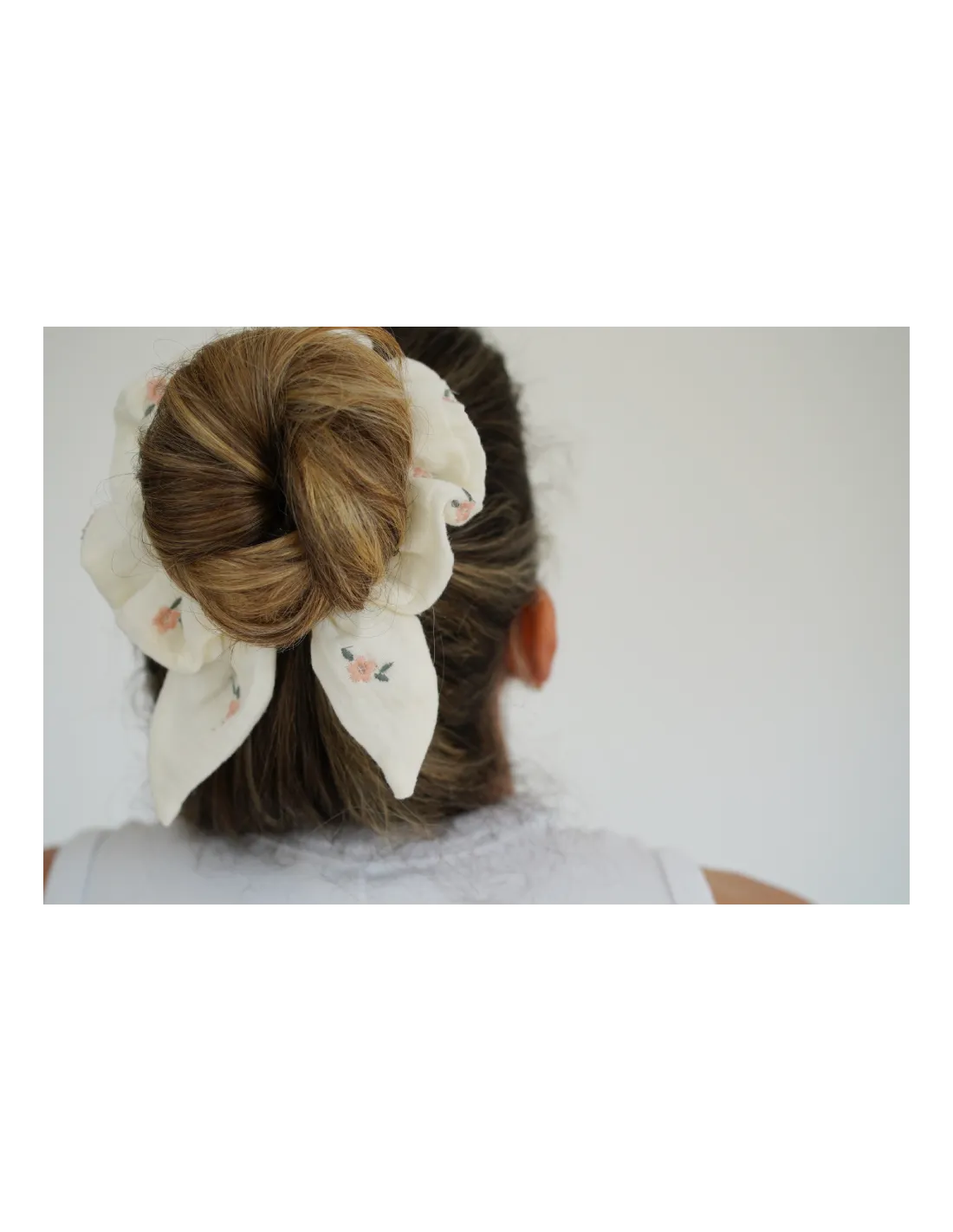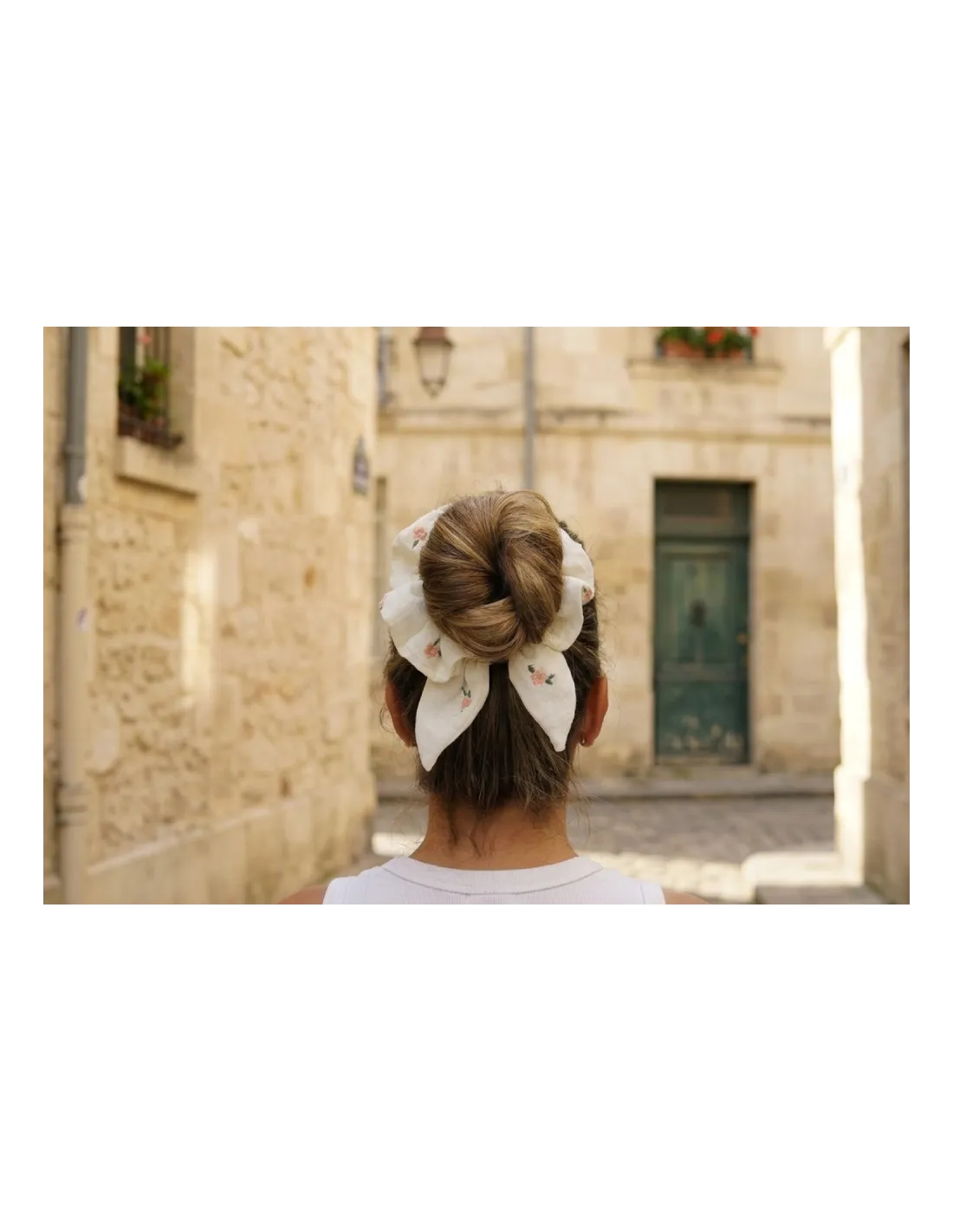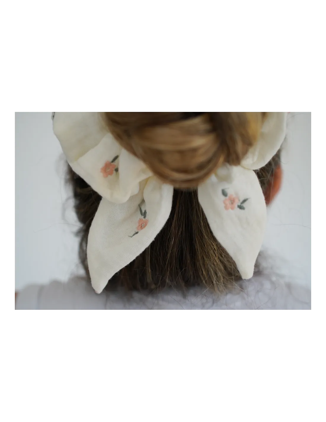 Un chouchou nœud en double gaze de coton ivoire délicatement brodé de petites fleurs rose poudré. Romantique et lumineux, il sublime vos coiffures avec douceur.