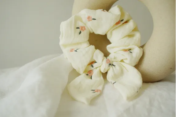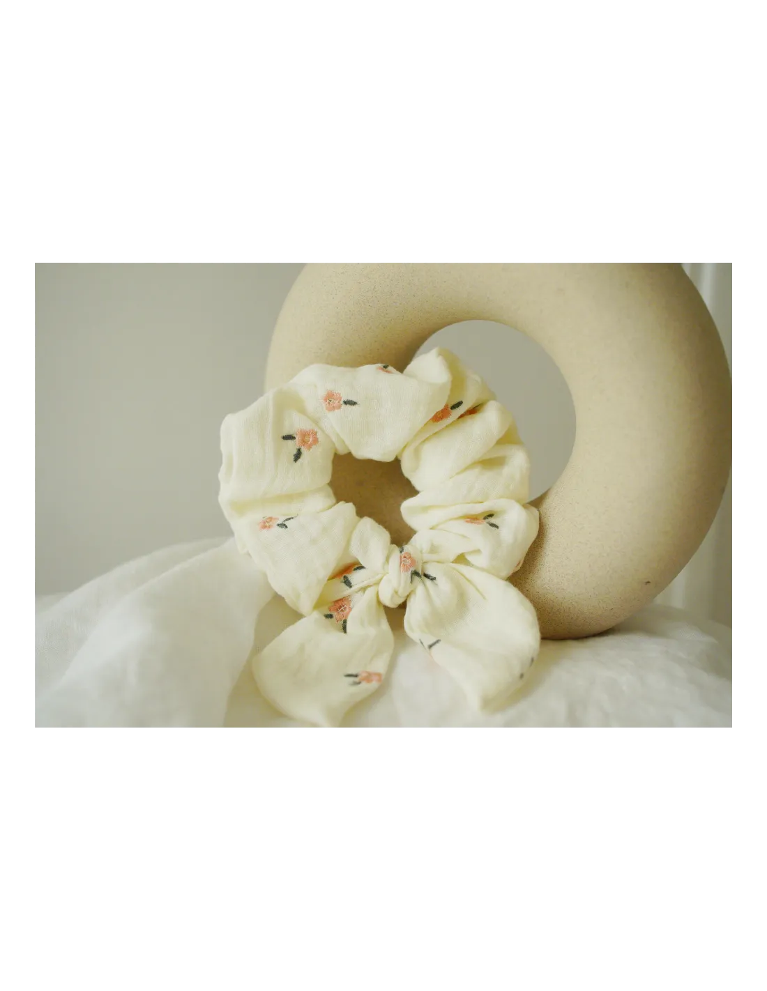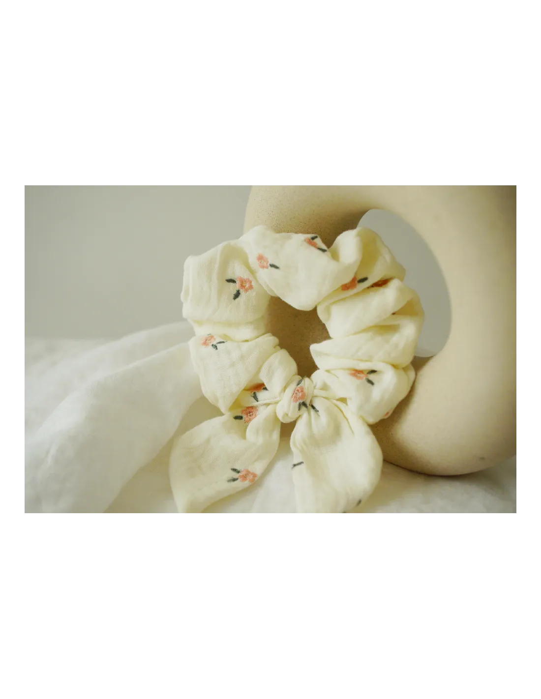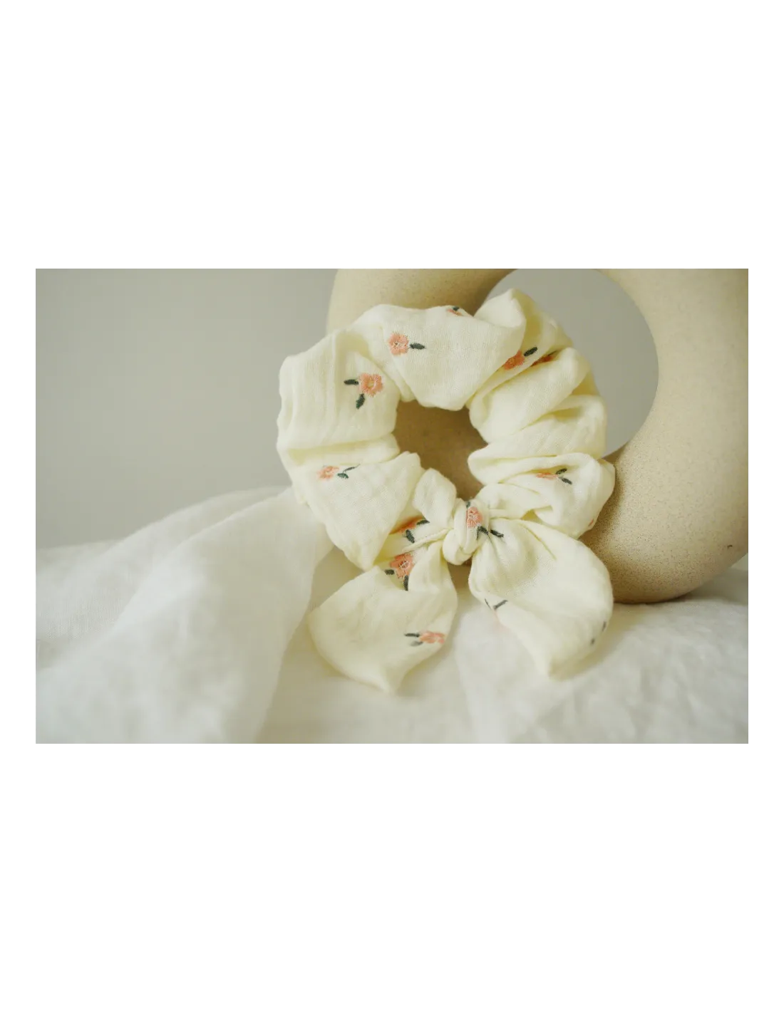 Un chouchou nœud en double gaze de coton ivoire délicatement brodé de petites fleurs rose poudré. Romantique et lumineux, il sublime vos coiffures avec douceur.