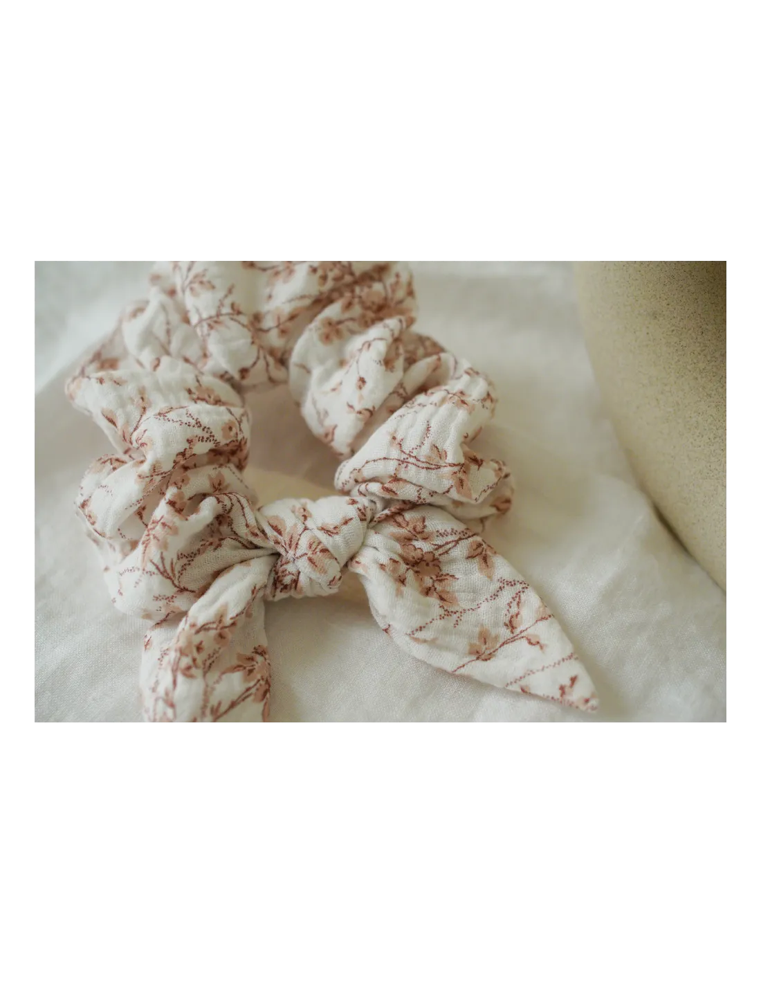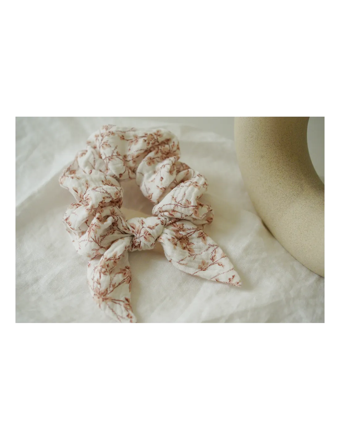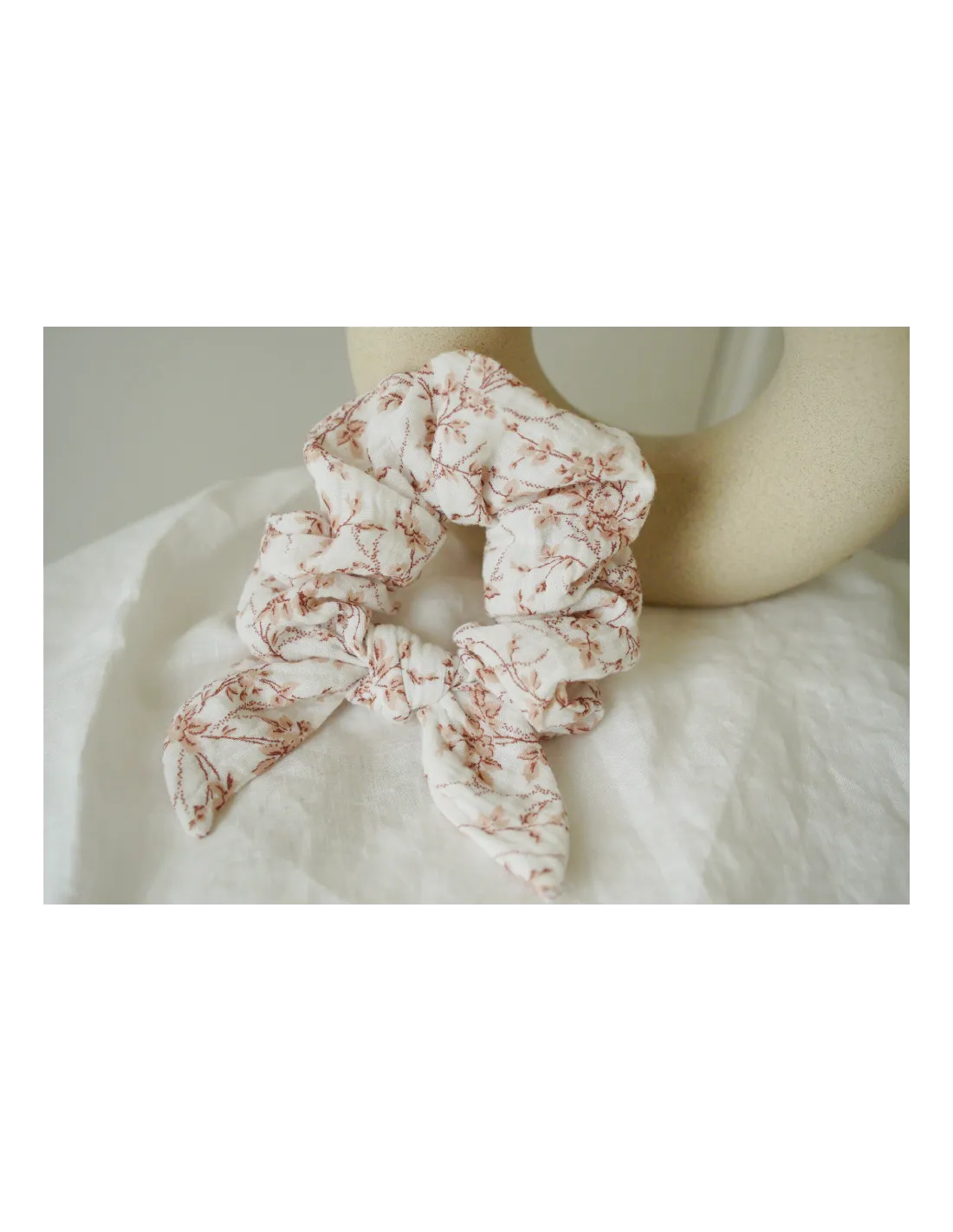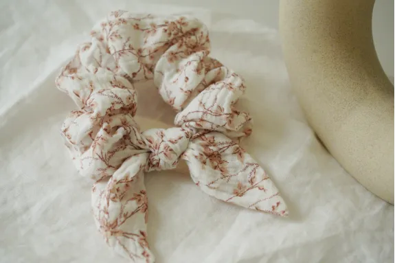 Un chouchou nœud en double gaze de coton ivoire délicatement imprimé de fleurs rose poudré. Romantique et lumineux, il sublime vos coiffures avec élégance.