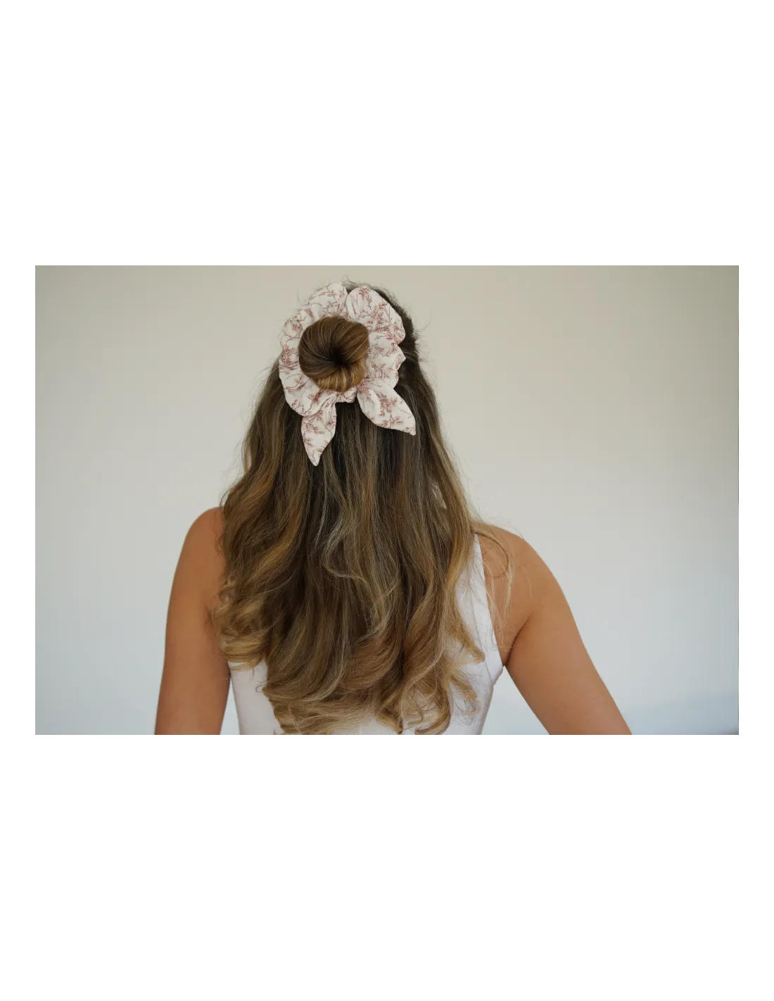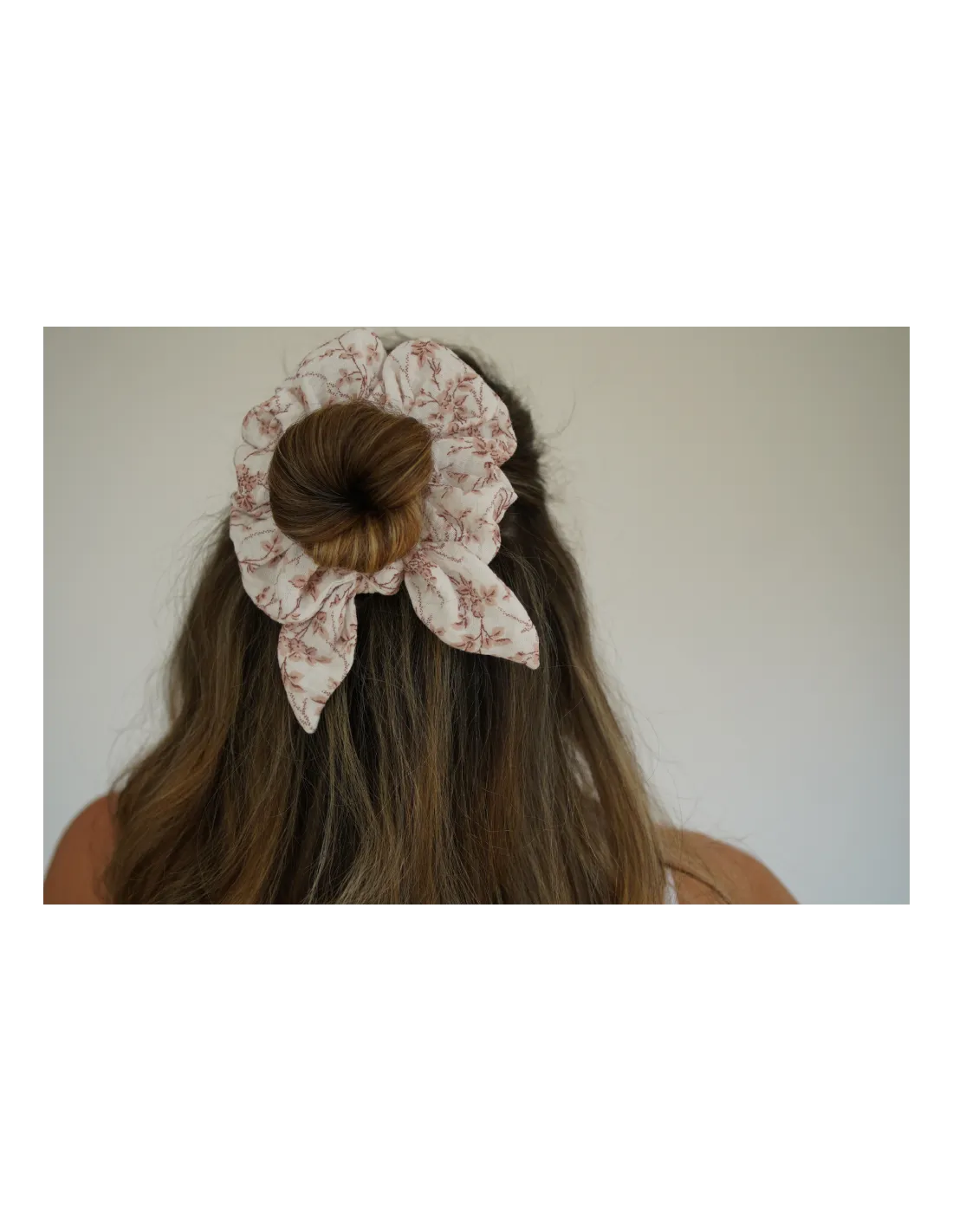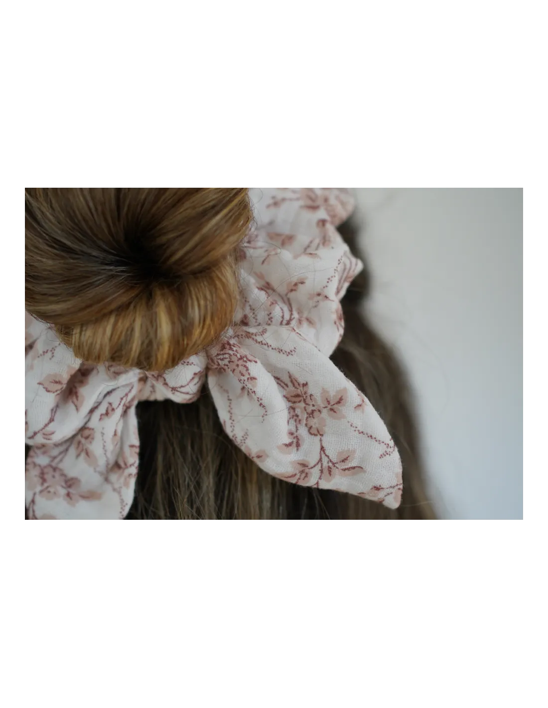 Un chouchou nœud en double gaze de coton ivoire délicatement imprimé de fleurs rose poudré. Romantique et lumineux, il sublime vos coiffures avec élégance.