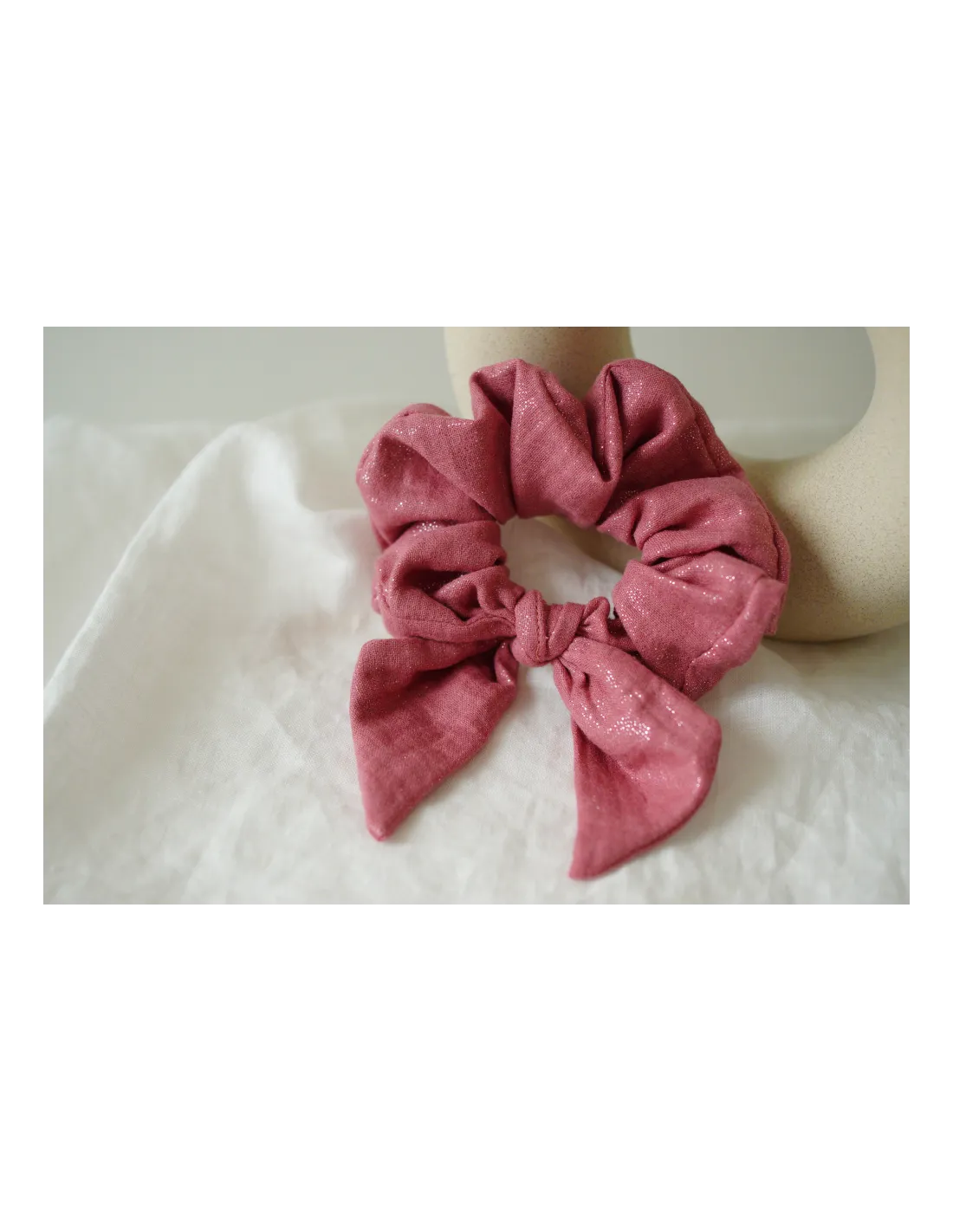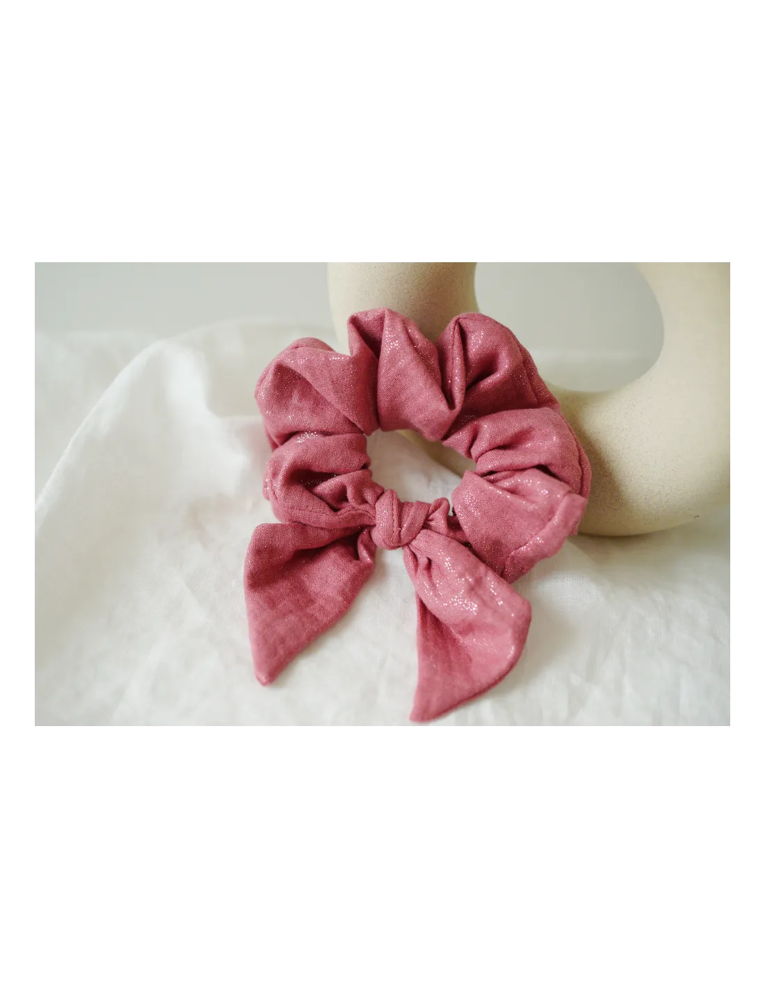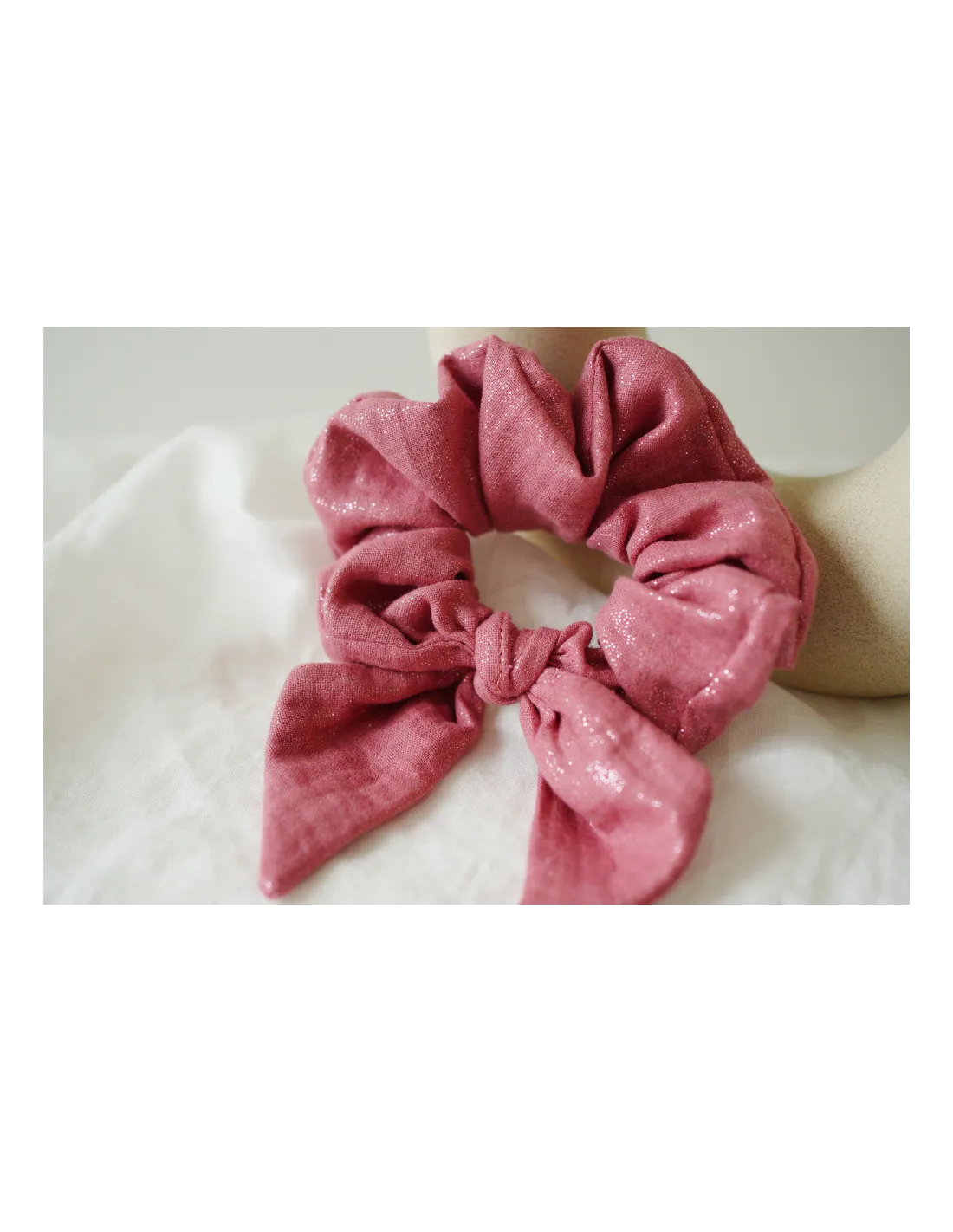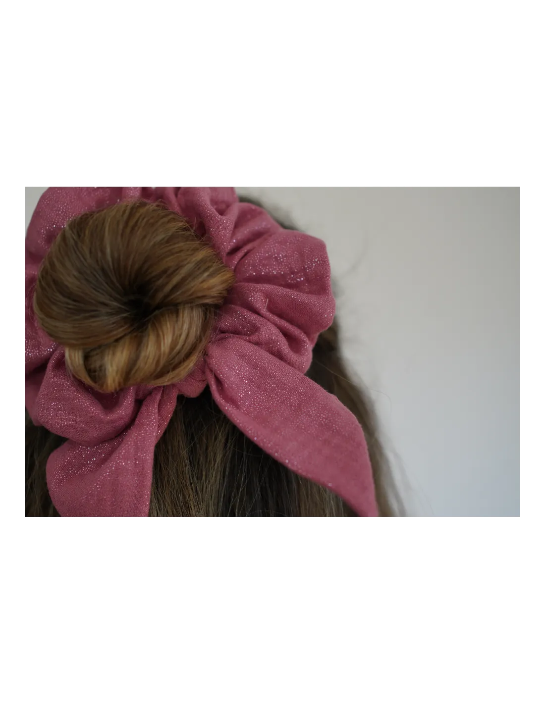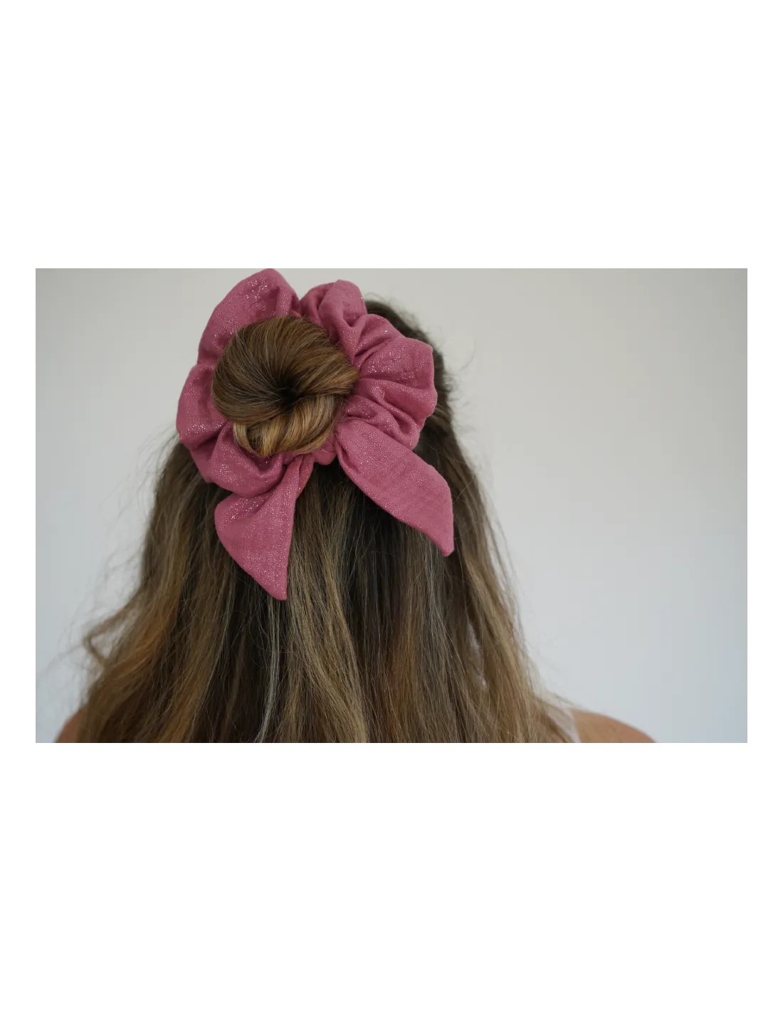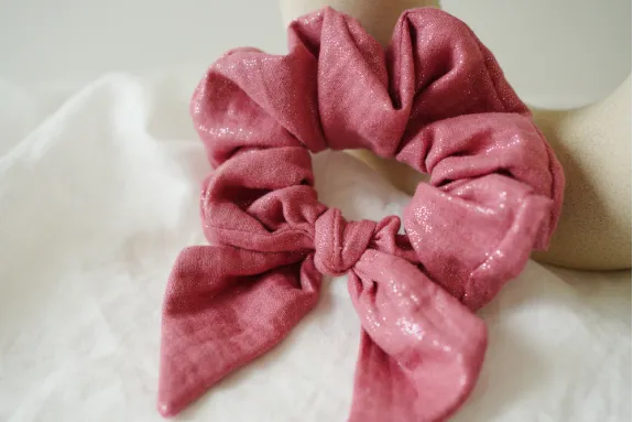 Un chouchou nœud en gaze de coton rose délicatement scintillant aux reflets dorés. Féminin et lumineux, il sublime vos coiffures avec élégance.
