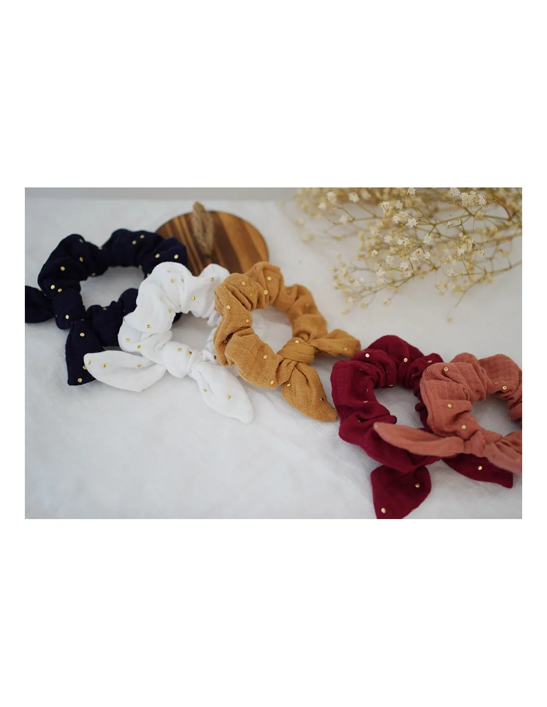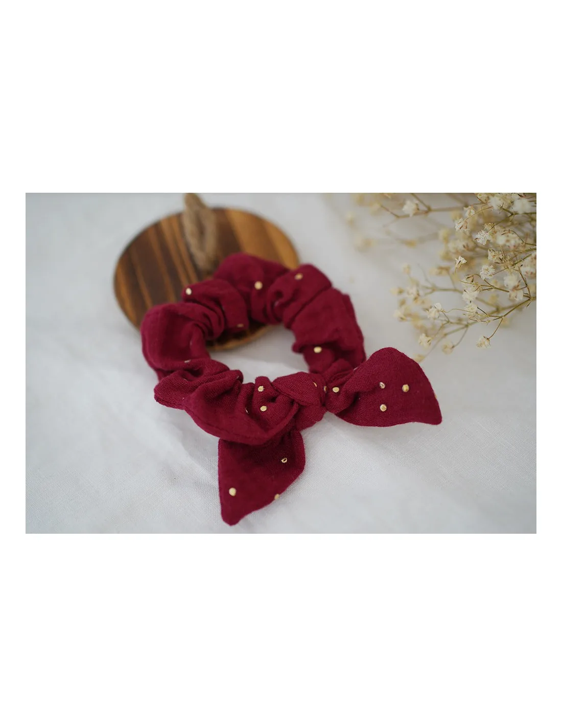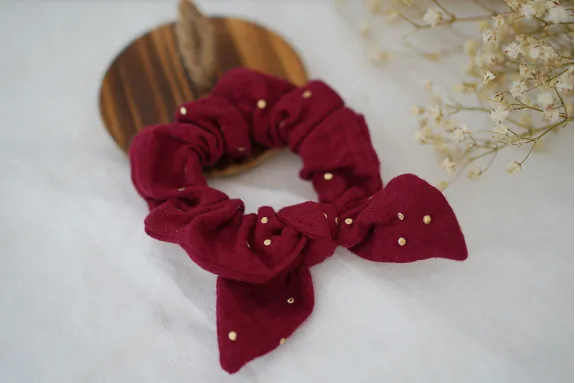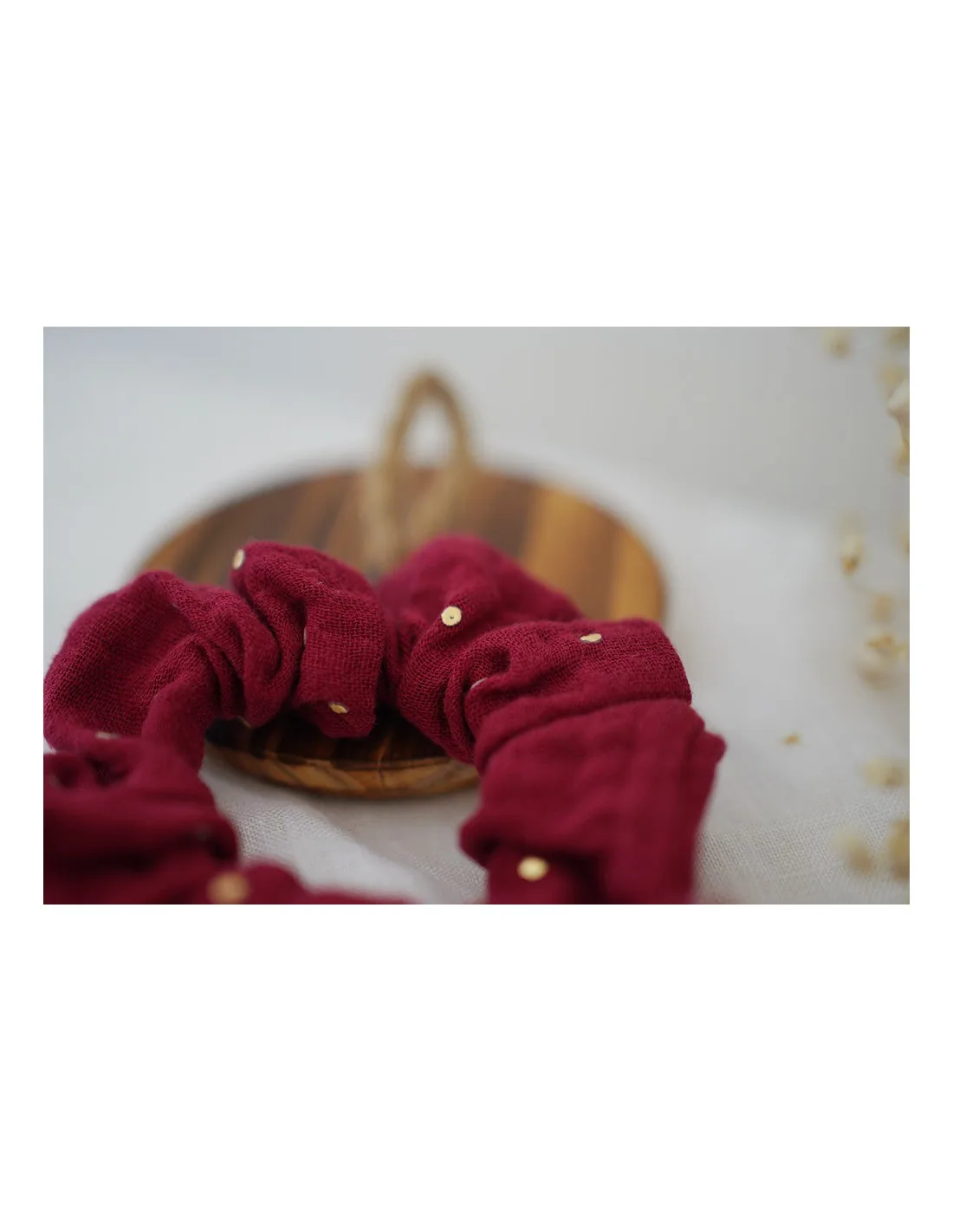 Chouchou noeud cheveux enfant Lou rouge grenat et doré, en gaze de coton, fabriqué en France.