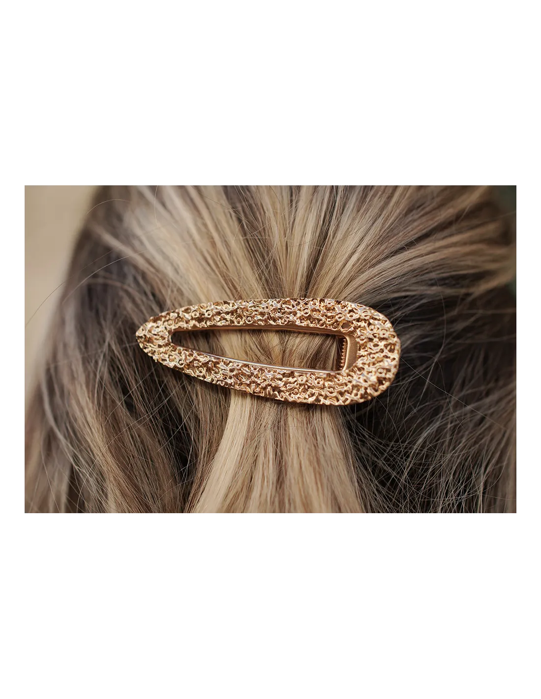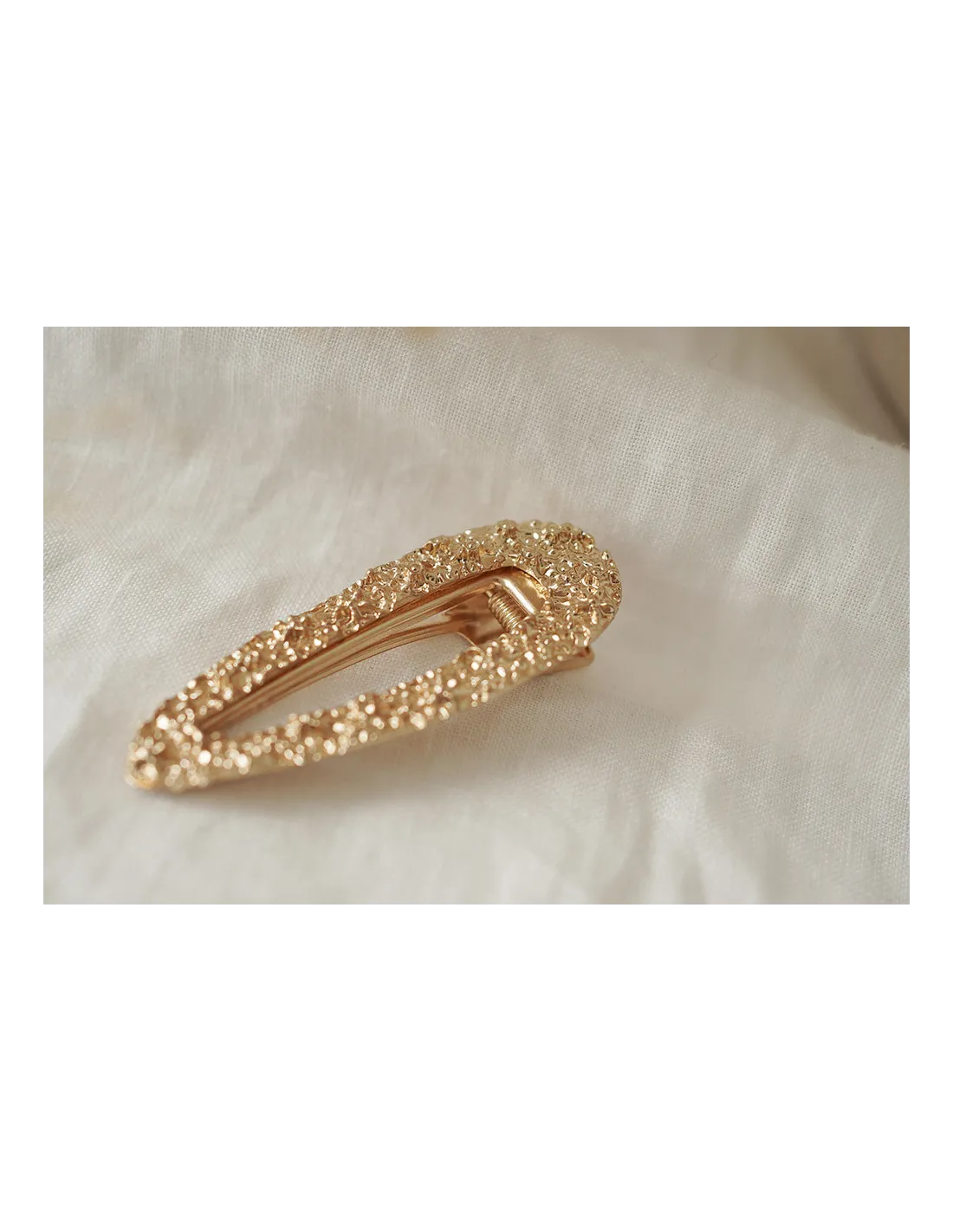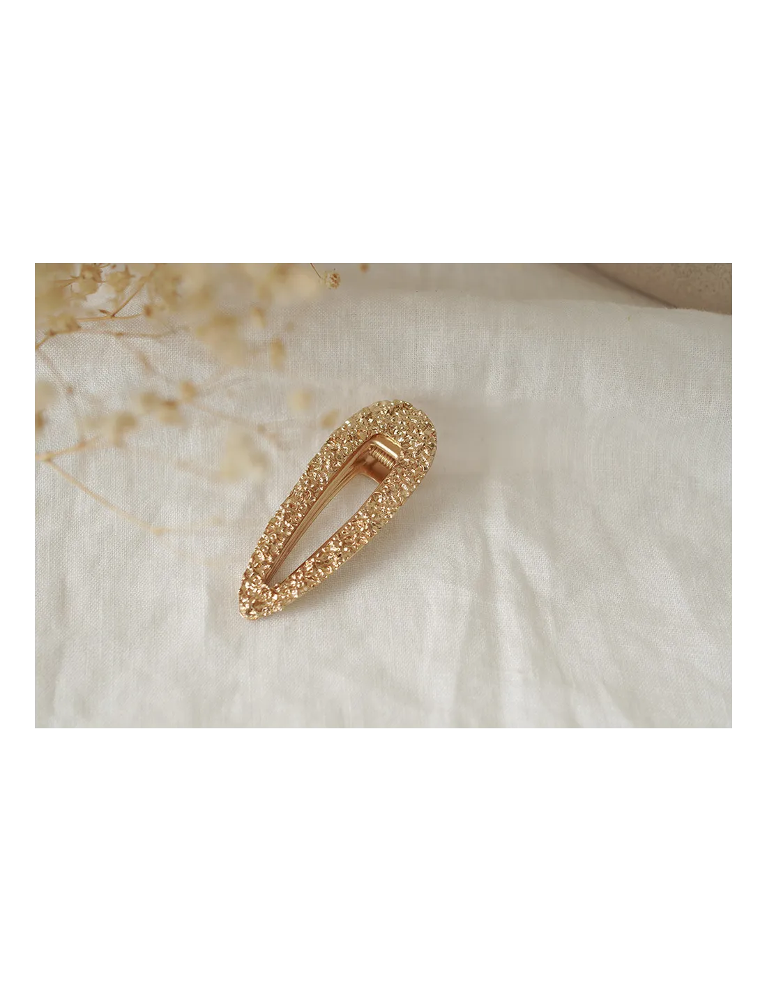 Nous vous présentons la jolie barrette martelée dorée Ambre en forme de pince.