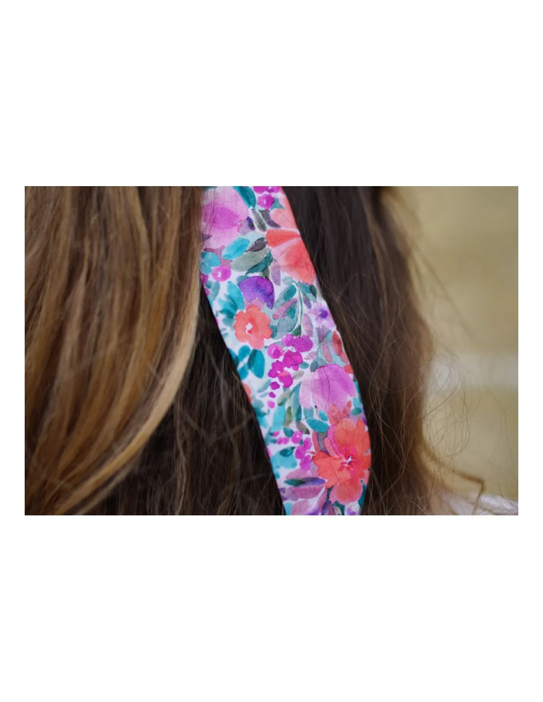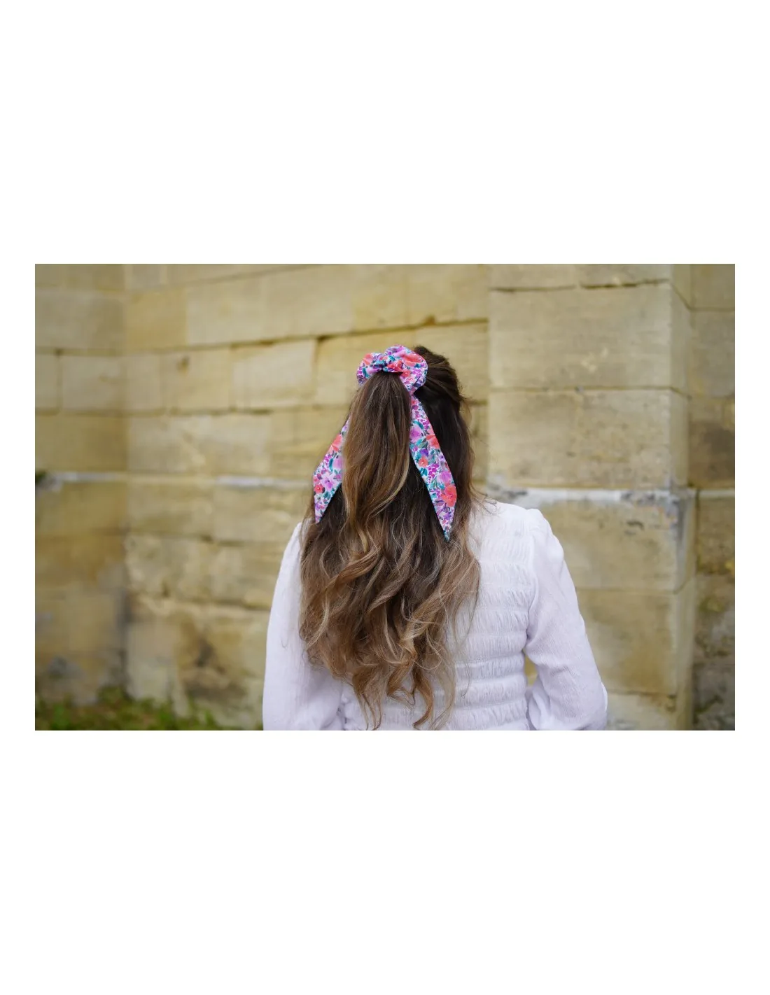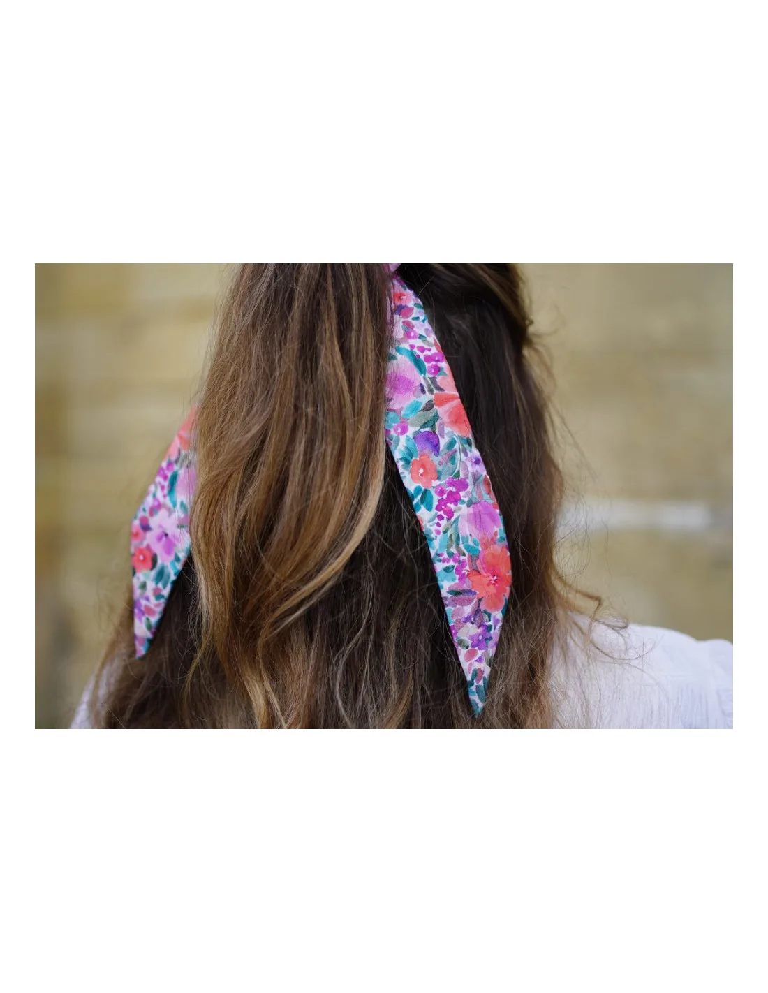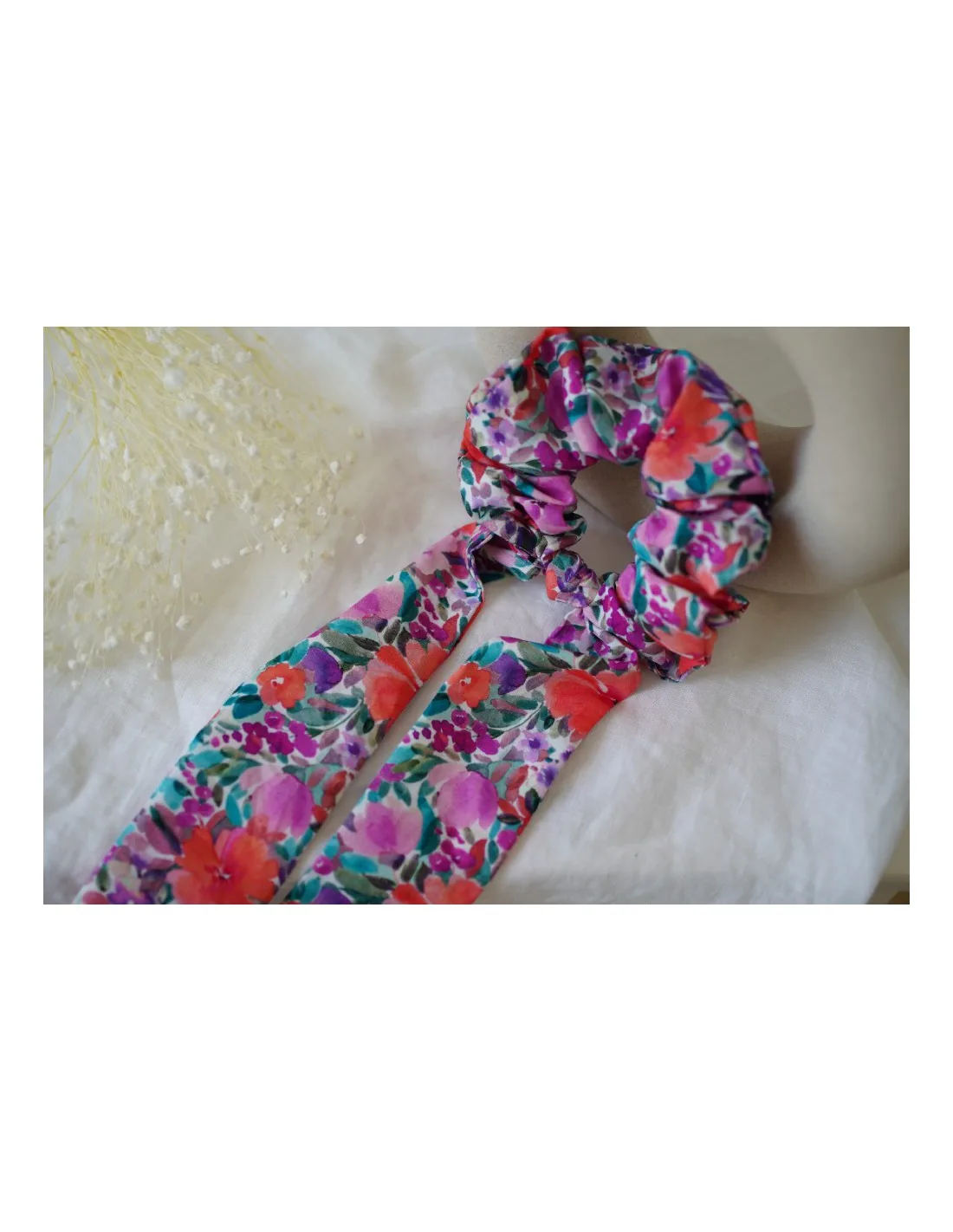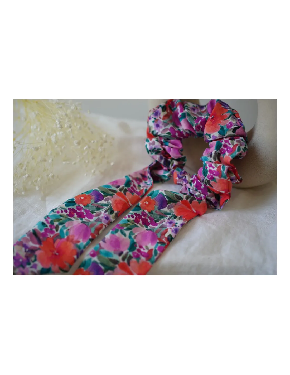 Ce modèle de chouchou deux-en-un, à la fois chouchou classique et ruban, se distingue par son imprimé floral vif dans des tons rose, orange et violet, qui évoquent les couchers de soleil d’été.