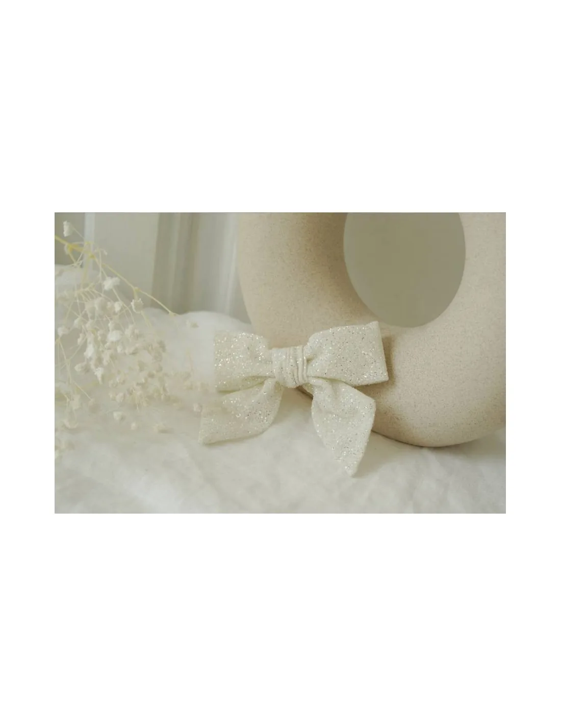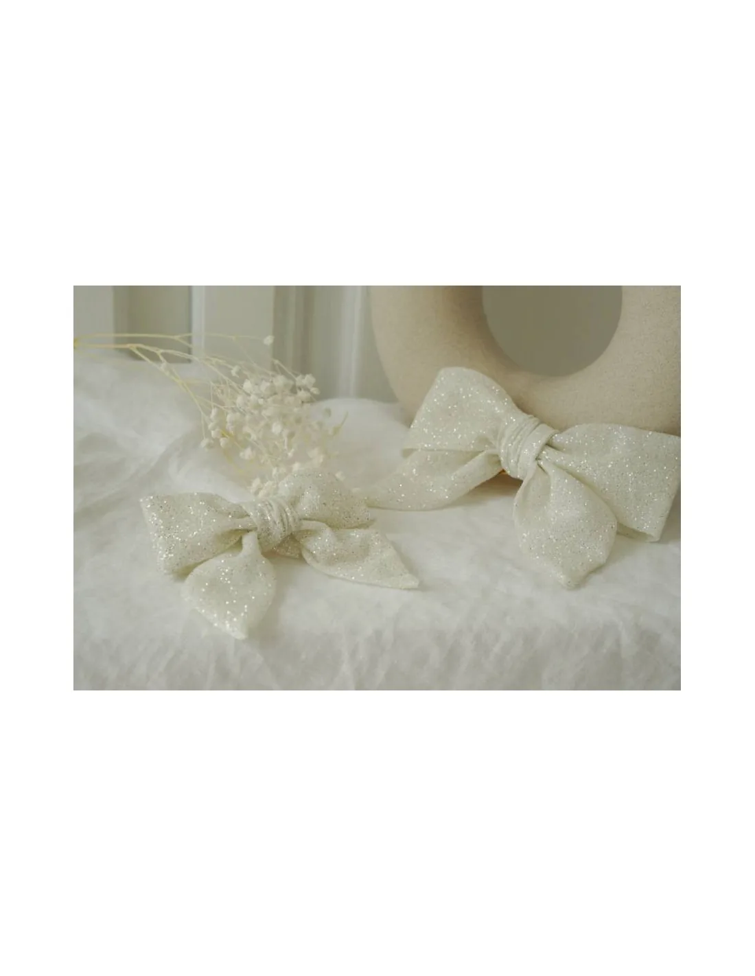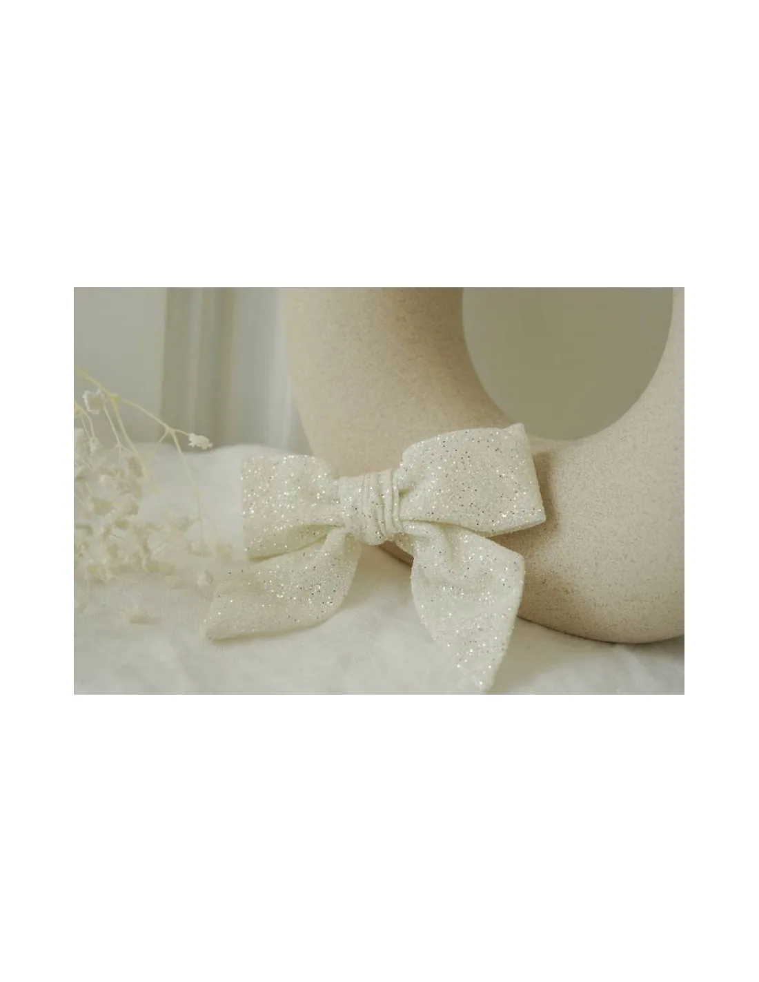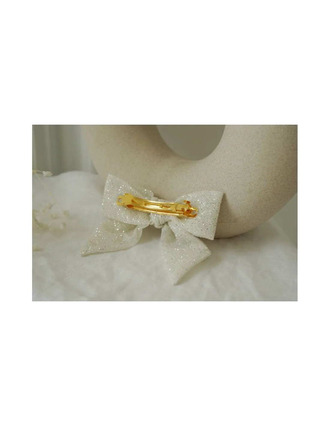 Cette élégante barrette nœud pailletée blanche séduit par son tissu délicatement scintillant qui capte la lumière avec finesse. Son blanc lumineux en fait un choix parfait pour une cérémonie, un mariage, un baptême, un anniversaire ou toute occasion spéciale.